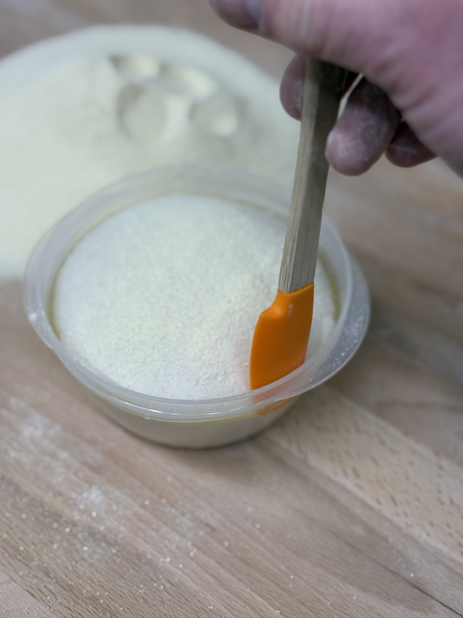 Plastbunken är från Nordiska Plast i Gislaved och är smord invändigt med olivolja Den går att använda från -40 till 120℃ samt tål maskindisk, perfekt att ha toppings i eller som matlåda (Värde ca 19 kronor)