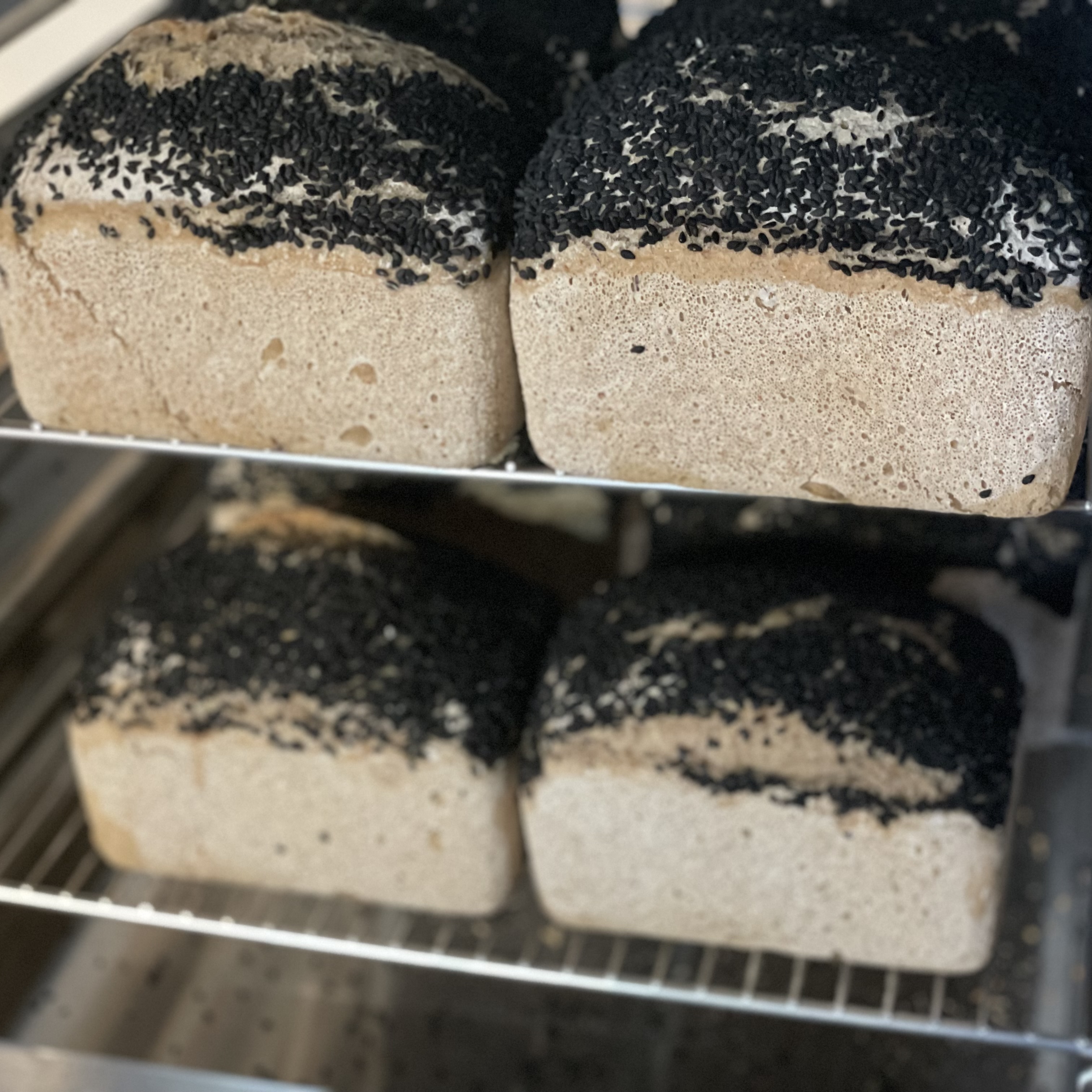 Ett ljust formbröd (Rostbröd) av surdeg med vete, fullkornsråg, fullkornsdinkel alt fullkornsemmer, vatten, sesamfrön och salt (form smord med smör)