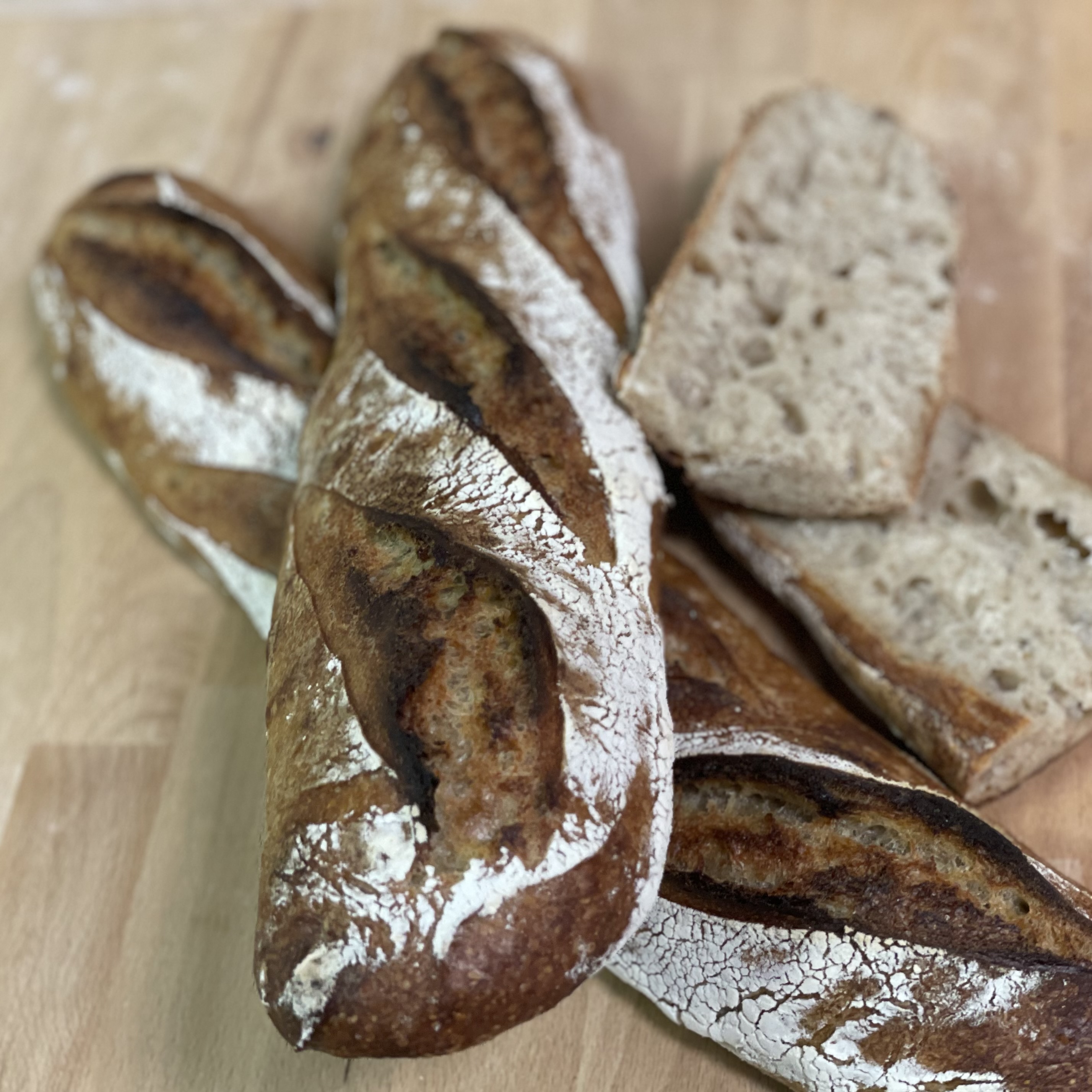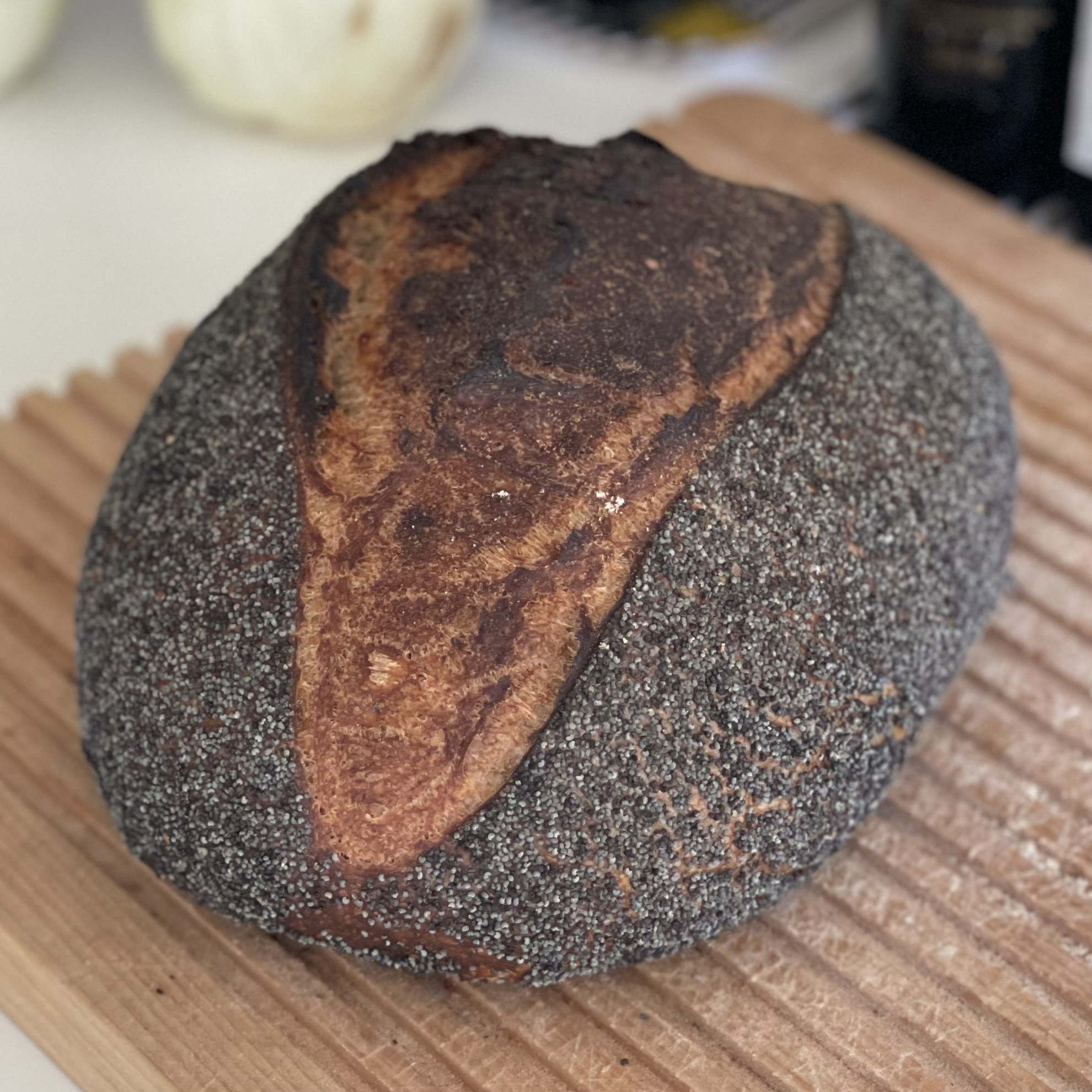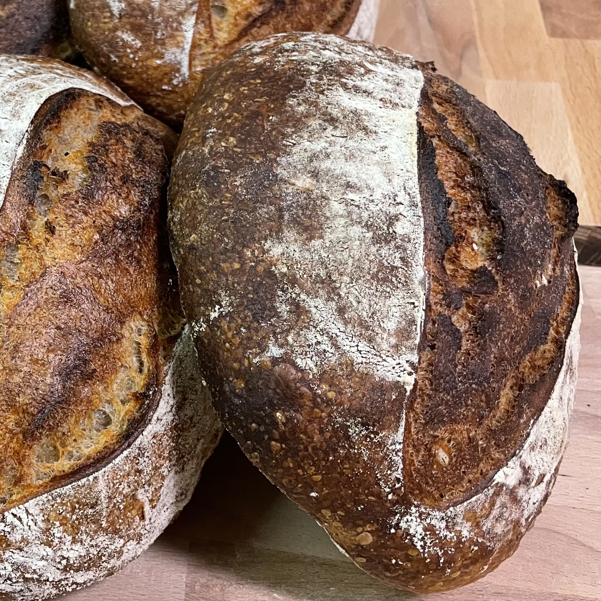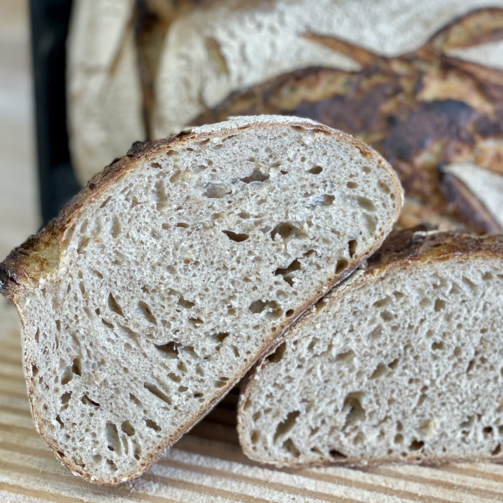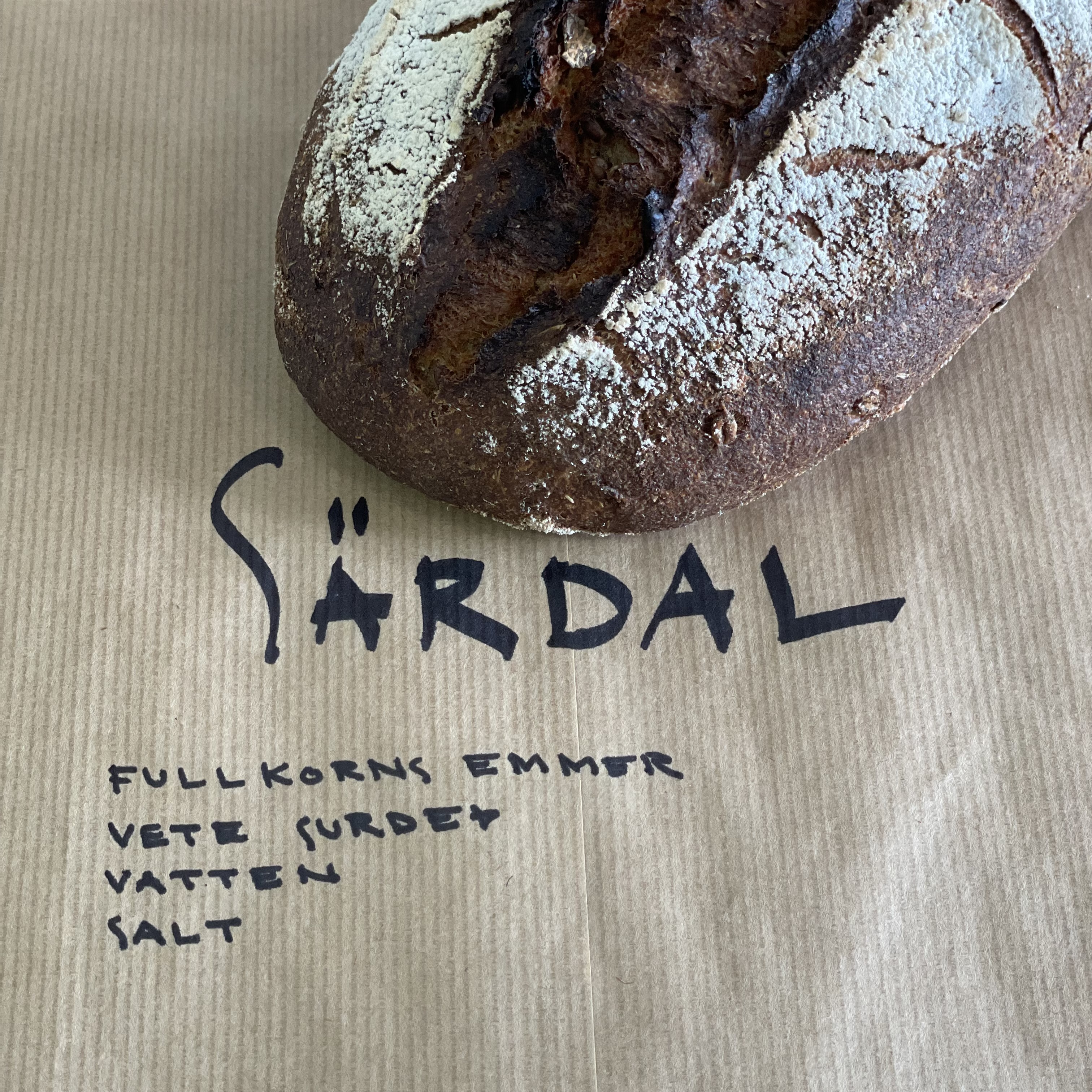 Ett surdegsbröd av urvetet Emmer med fullkornsemmer, vete, vatten och salt