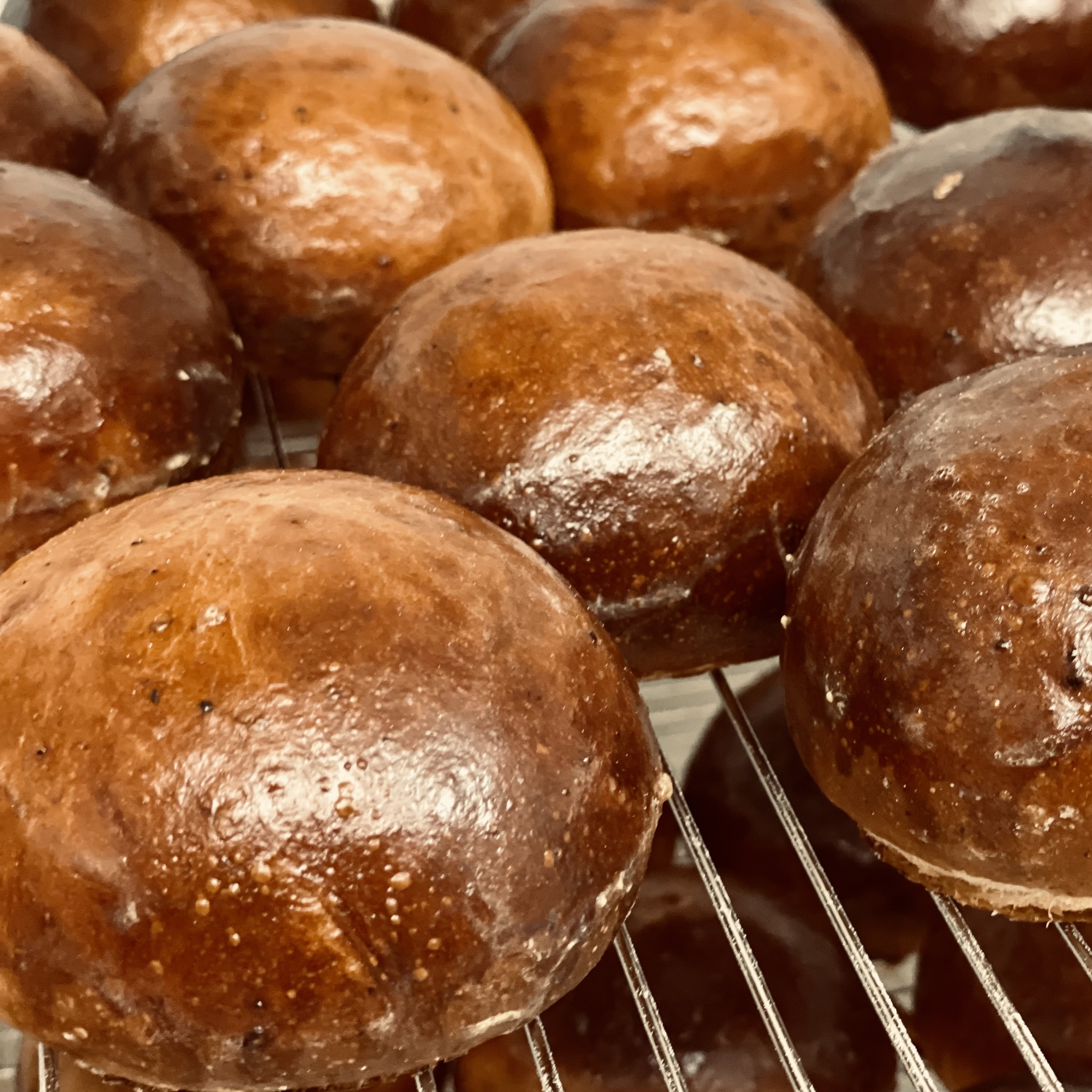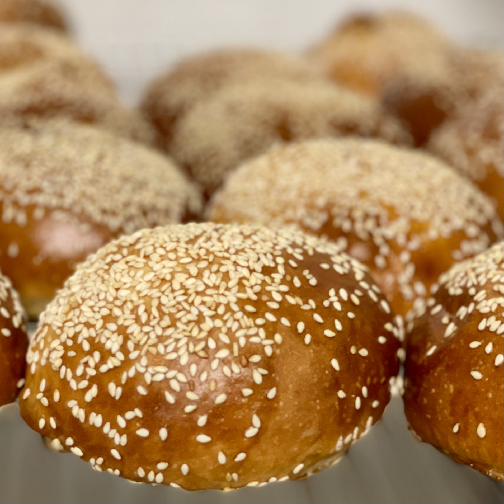 Hamburgerbröd med vete, smör, mjölk, sirap, sesamfrön, jäst och salt (Penslad med ägg)