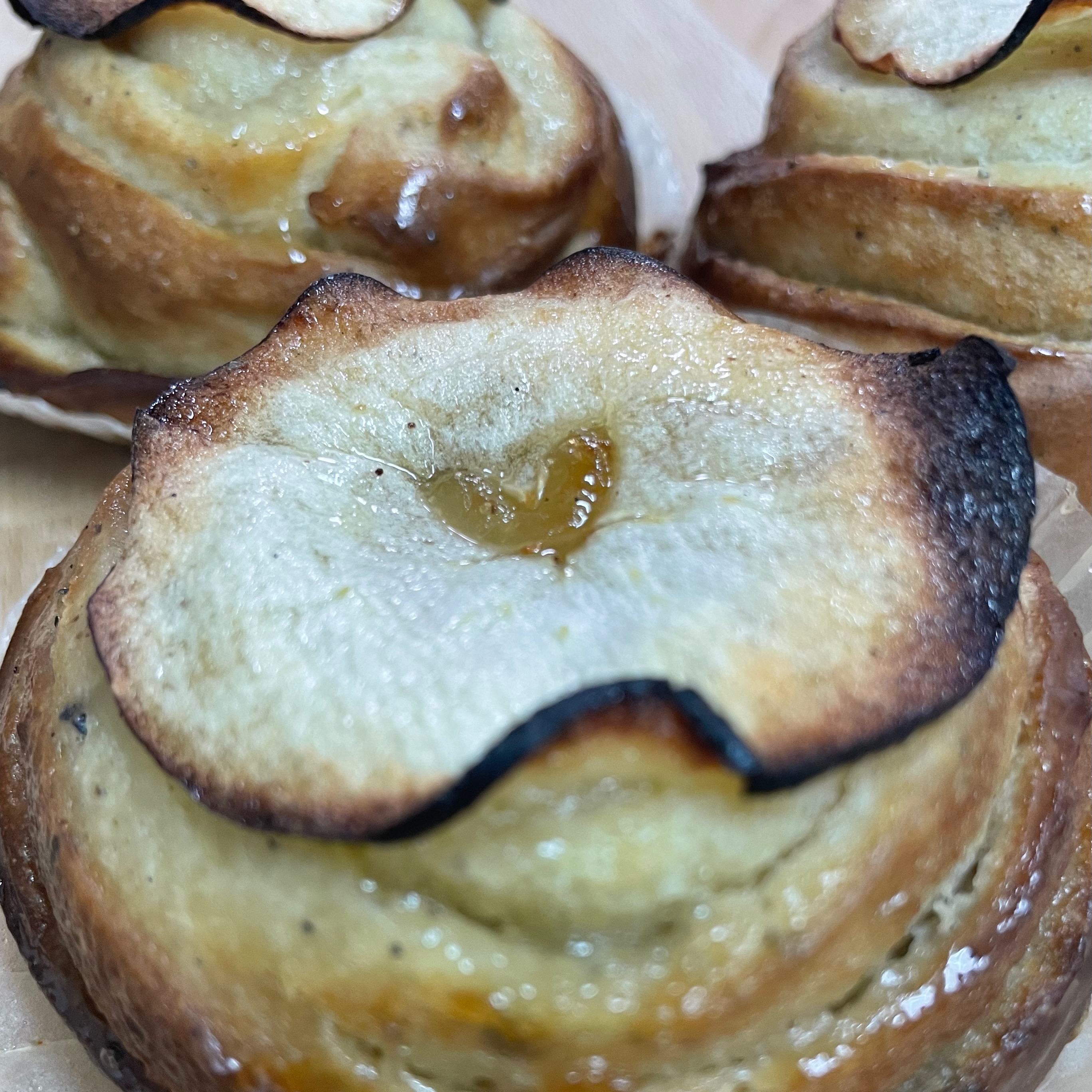 Bullar med tex. äpple/rabarber/hallon-kompott mm med vete, vatten, smör, socker, ägg, jäst och salt samt toppings