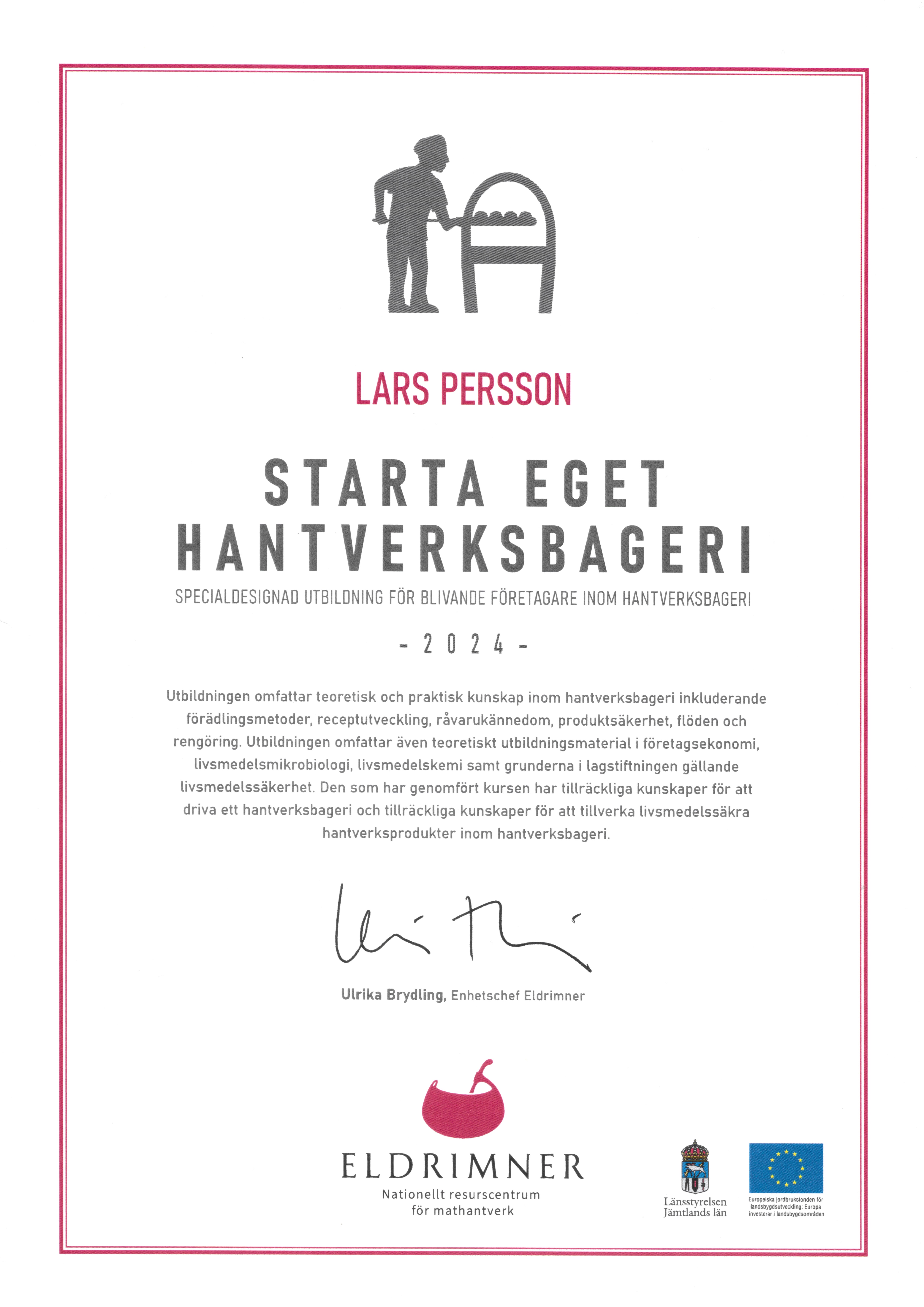 Under hela hösten 2024 så vidareutbildade jag mig hos Eldrimner i Ås (Hantverksbageri) för att fördjupa min kunskap samt utöka sortimentet. Även bageriet uppgraderas, ökad kapacitet samt utrustning som möjliggör bakning av flera sorters bröd.